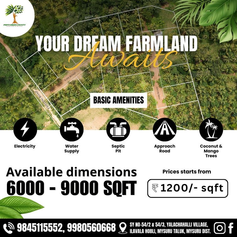 Poovi Green County is dedicated to providing serene and sustainable farmland plots near Mysore. Our mission is to offer a harmonious living environment where nature meets modern infrastructure. We envision a community that thrives on agricultural prosperity while maintaining ecological balance. With a commitment to quality and customer satisfaction, Poovi Green County is your gateway to a greener future.